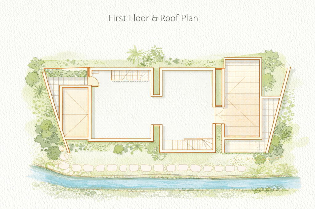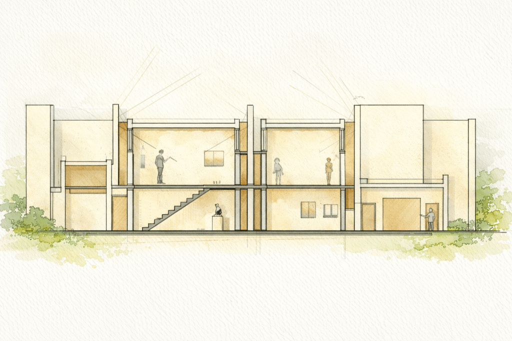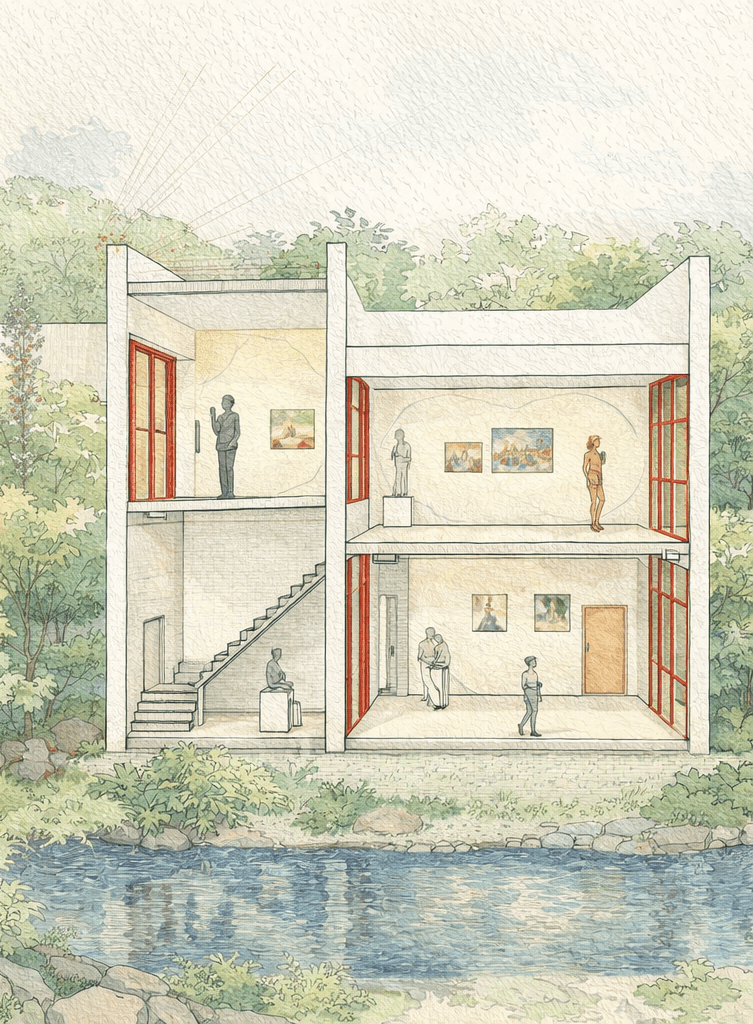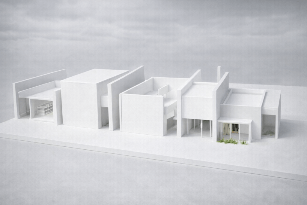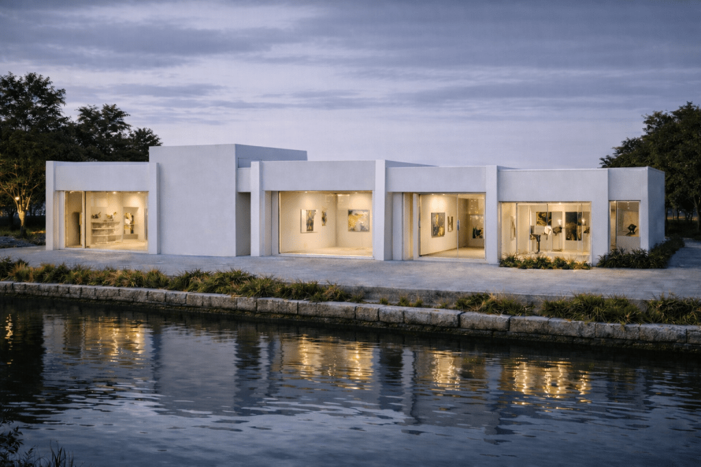 This project is developed as a conceptual architectural proposal for a linear art gallery complex along a canal. The design is defined by a sequence of flat-roofed volumes and uniform vertical partitions, establishing a clear rhythm and a strong volumetric identity.