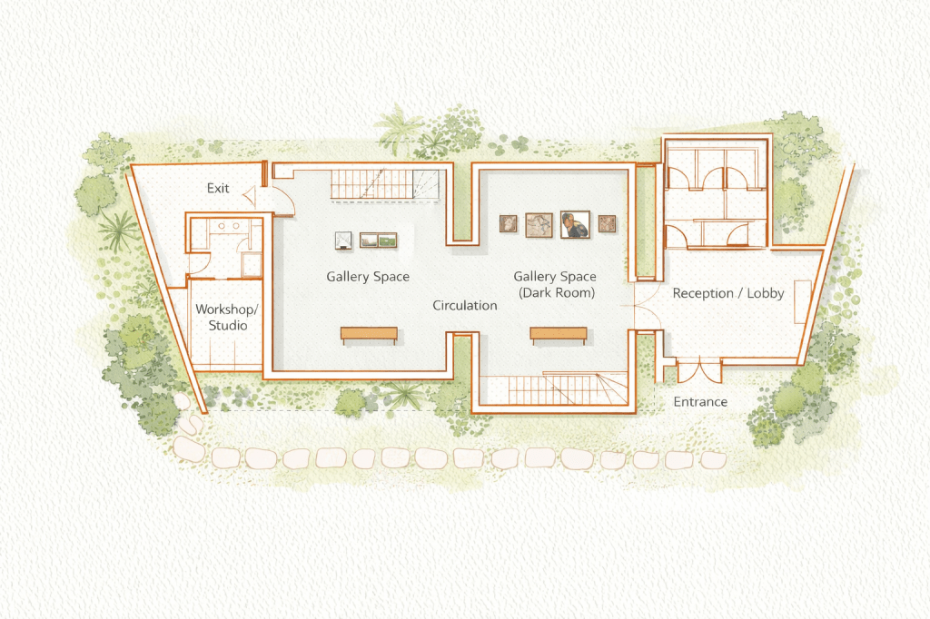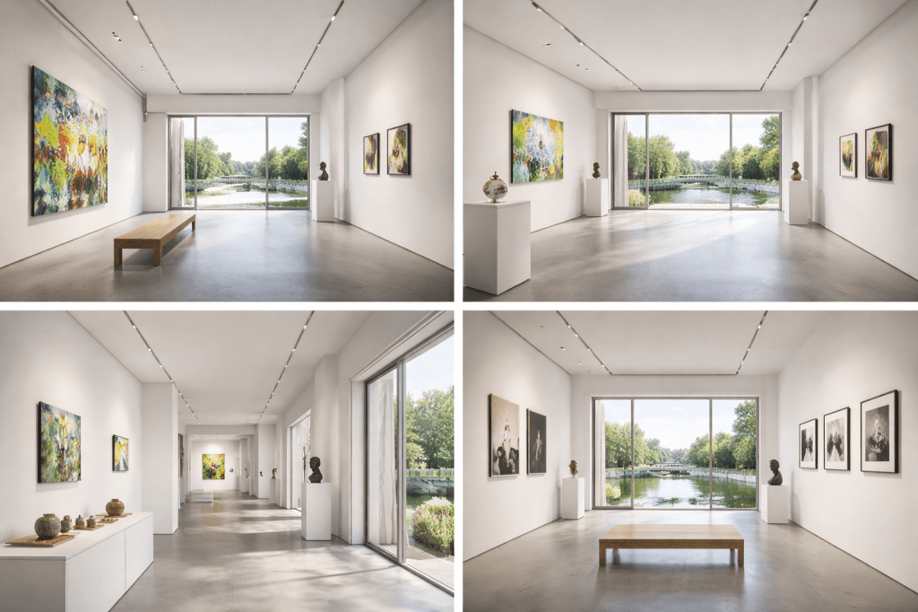 Large glazed openings connect the exhibition spaces with the surrounding landscape, allowing light, reflections, and interior activity to shape the architectural experience. The proposal explores repetition, scale, and spatial continuity, creating a calm and cohesive environment for contemporary cultural use.